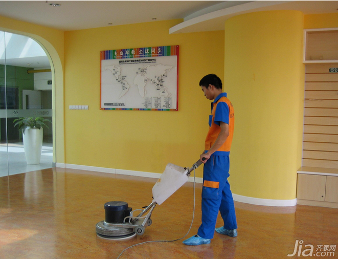 地面的清洗:把立面墙壁、玻璃、阳台、厨房、卫生间做完以后,就是地面清洗了,地面也要分清材质,是木地板、抛光砖、高光砖、胶地板或是天然石材、人造石,当分清材质后就选择专用清洁剂稀释开始清洗。地面上的胶渍可用除胶剂清洁